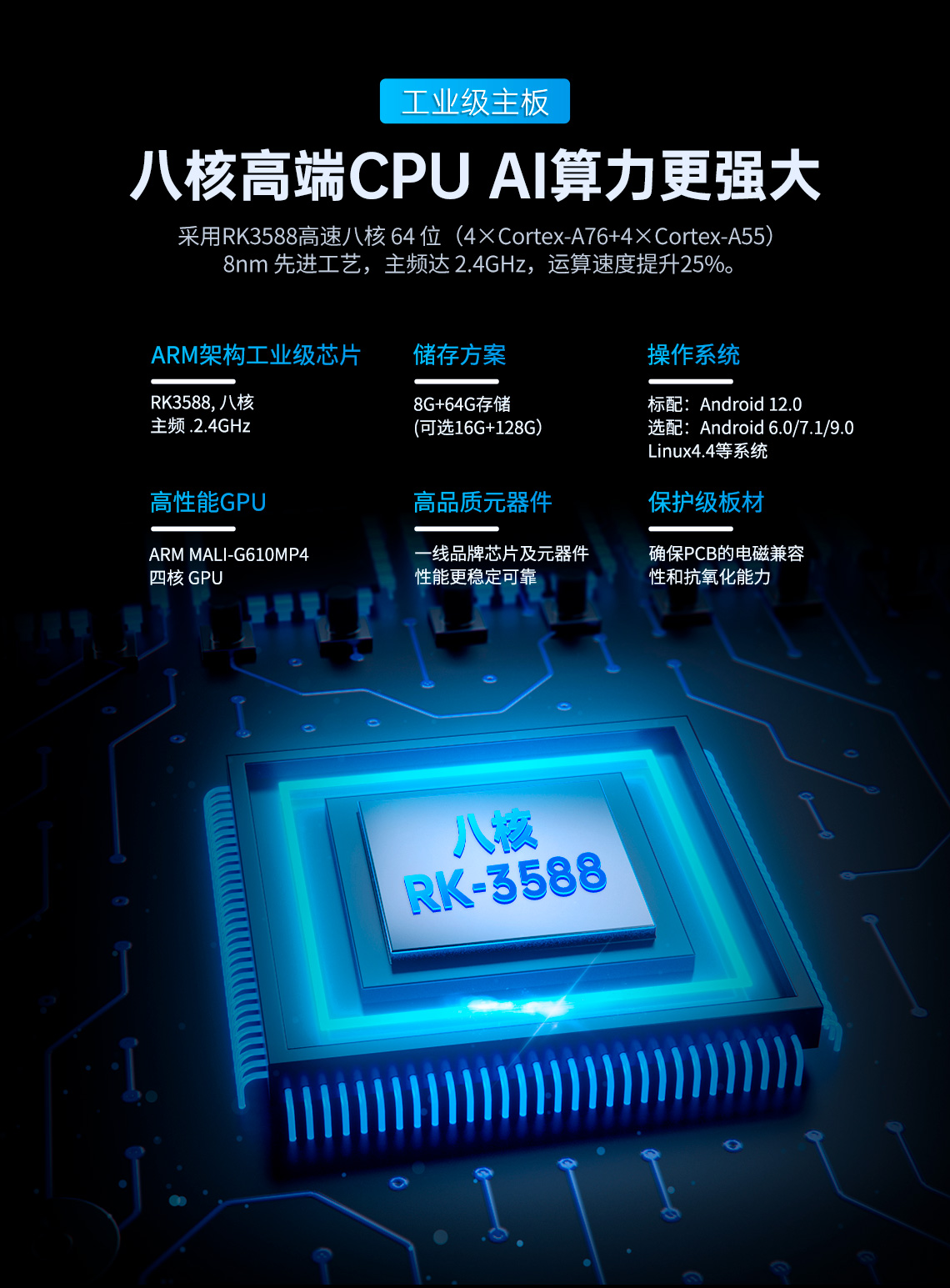 采用RK3588高速八核64位,8nn先進(jìn)工藝,主頻2.4G Hz,運(yùn)算速度提升25%