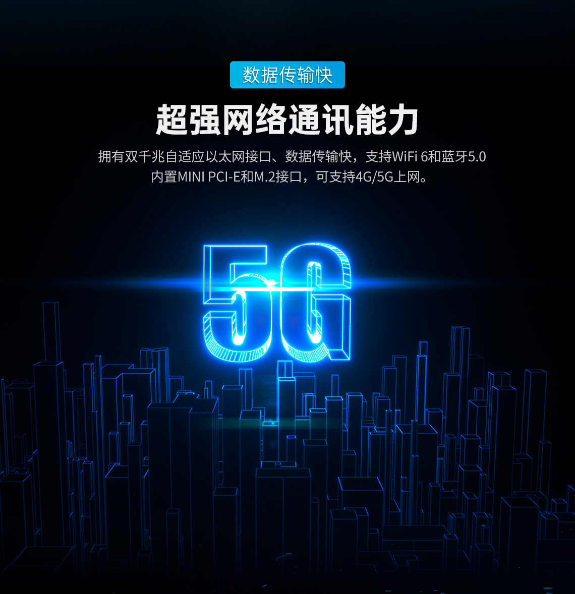 擁有雙千兆自適應(yīng)以太網(wǎng)接口、數(shù)據(jù)傳輸快,支持WIFI 6 和藍(lán)牙 5.0,內(nèi)置MINI PCI-E和M.2接口,可支持4/5G上網(wǎng)