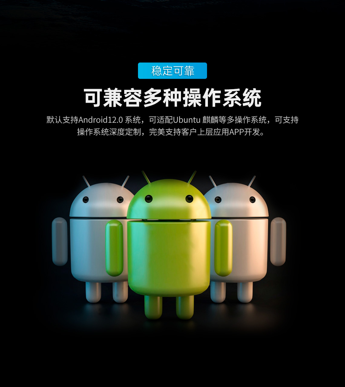 默認(rèn)支持Android12.0系統(tǒng),可適配Ubuntu麒麟等多操作系統(tǒng),可支持操作系統(tǒng)深度定制,完美支持客戶上層應(yīng)用APP開發(fā)